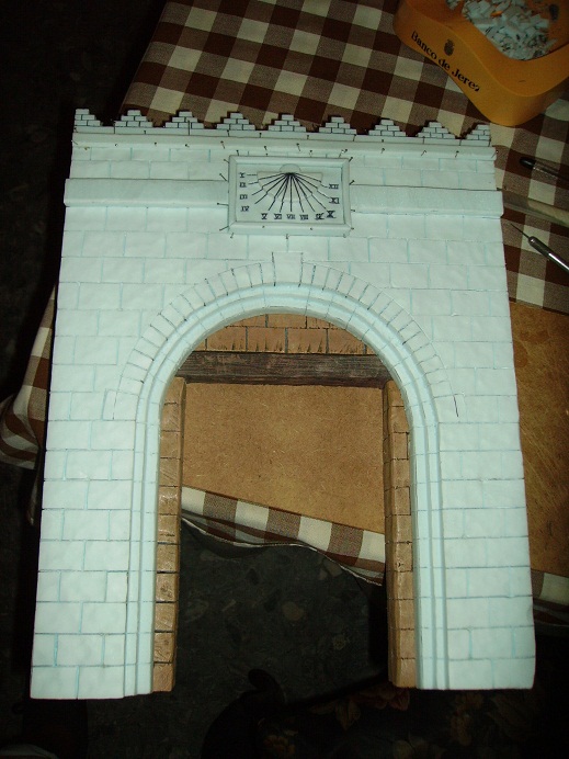Bueno, pue eso es lo que os intento reflejar con la primera foto. Lo estoy haciendo con la fachada de la puerta de la ciudad. Arriba de la puerta he colocado un reloj de sol, y en la parte superior ya le he puesto las almenas.