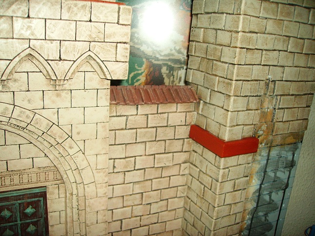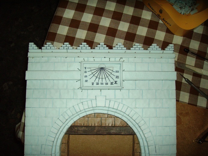 Bueno, pue eso es lo que os intento reflejar con la primera foto. Lo estoy haciendo con la fachada de la puerta de la ciudad. Arriba de la puerta he colocado un reloj de sol, y en la parte superior ya le he puesto las almenas.