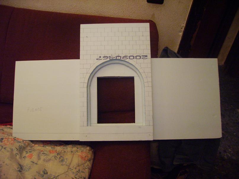 Bueno, pues ya están cortadas todas las piezas y ya he empezado mis habituales pruebas de monstaje. He cortado también las piezas de la nueva fuente y del suelo, para ver si encajaban como yo quería, y así ha sido. He cortado dos piezas para los escalones de acceso a la puerta de la sinagoga, y he practicado dos aberturas en la paredde la fuente por donde encajaré las piezas del depósito de agua.