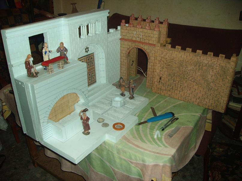 Aqui os dejo algunas fotos más. Como vereis, he sacado piezas del año pasado para comprobar que todo iba bien y se ajustaban unas con otras. Además de que quería ver cómo quedaban. También le he puesto algunas figuras, para darle algo más de vida. La fuente pequeña que va delande de la escalera de la sinagoga la hice inspirandome en las que se ven por las calles del juego Assassin´s Creed, del que ya os dejé varias imágenes en os álbumes de fotos. La parte superior del templo la he decorado con unos triángulitos, a modo de friso. El paño celeste que cuelga sobre la fuente grande irá situado ahí, pero más arriba, dejado caer sobre la balaustrada del balcón o terraza. En él se puede ver un candelabro de siete brazos y una inscripción en hebreo que pone Yahvé.