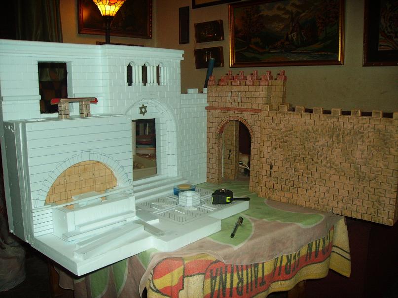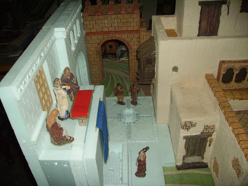 Aqui os dejo algunas fotos más. Como vereis, he sacado piezas del año pasado para comprobar que todo iba bien y se ajustaban unas con otras. Además de que quería ver cómo quedaban. También le he puesto algunas figuras, para darle algo más de vida. La fuente pequeña que va delande de la escalera de la sinagoga la hice inspirandome en las que se ven por las calles del juego Assassin´s Creed, del que ya os dejé varias imágenes en os álbumes de fotos. La parte superior del templo la he decorado con unos triángulitos, a modo de friso. El paño celeste que cuelga sobre la fuente grande irá situado ahí, pero más arriba, dejado caer sobre la balaustrada del balcón o terraza. En él se puede ver un candelabro de siete brazos y una inscripción en hebreo que pone Yahvé.