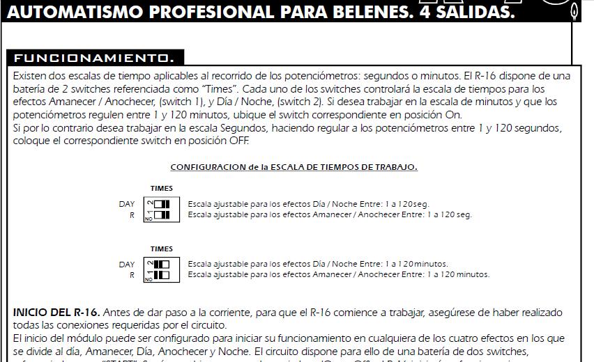 rr.jpg (94KB - 300 descargas)Mario a la pregunta que me haces, te contesto que para un belén sencillo un encendido progresivo sería para amanecer y día y otro progresivo sería para atardecer noche, los encendidos rapidos el del día para molinos y cosas que puedan funcionar durante el día y el otro para cosas que funcionen de noche.