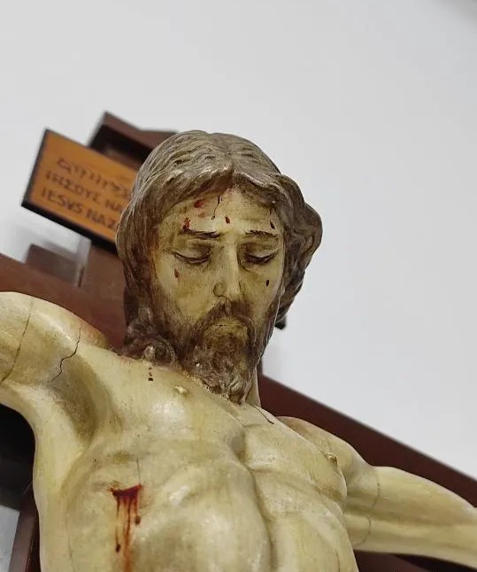 TALLA MADERA: CRISTO CRUCIFICADO DE RENART EXCELENTE TALLA DE MADERA REALIZADA POR LOS TALLERES RENART DE BARCELONA A PRINCIPIOS DEL XX IMAGEN DE CRISTO Y CRUZ DE MADERA CON PLAFON DE TERCIPELO Y MARCO DORADO. EL CRISTO MIE 30X36 CM. LA CRUZ 75X50 CM. Y EL PLAFON 105X65 CM. - TIENE UN SELLO RENART EN LA PARTE TRASERA. SE ENCUENTRA EN BUEN ESTADO, EL MARCO DEL PLAFON TIENE ALGUN DESCONCHE.