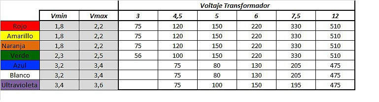 Como ejemplo tengo un led Blanco y lo quiero conectar a un tranformador de 5v pues segun la tabla y tendria que poner una resistencia de 100 Ohmios