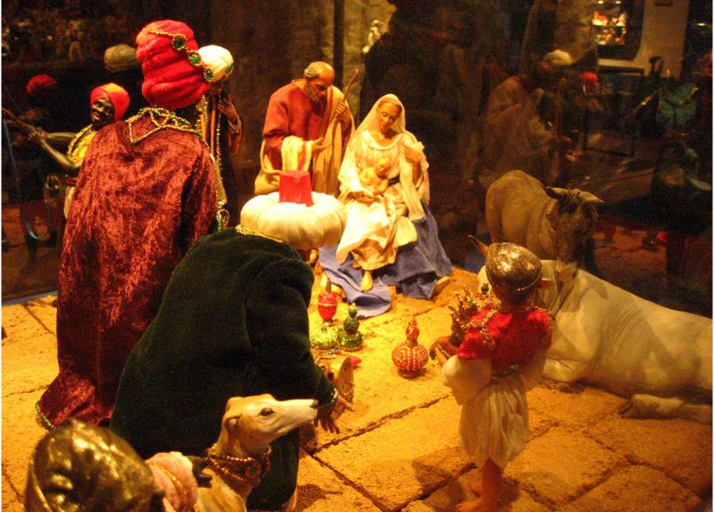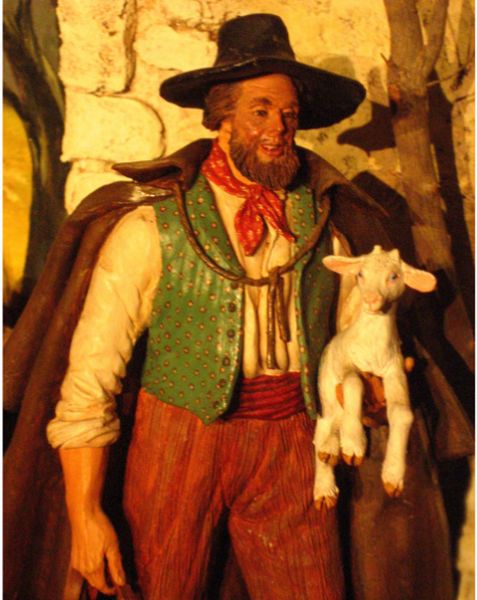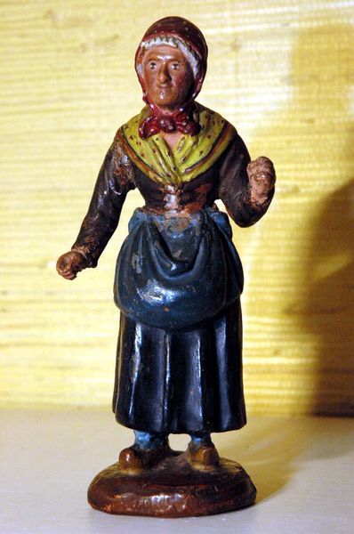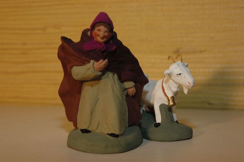 Efectivamente pienso que la figura es muy rara, aunque la indumentaria nos da varias pistas. Si pienso que represente a una pastora de cabras, tal vez cuando bajan con los rebaños de las montañas y por eso no lleva explicitamente los presentes. Su zona de origen bien pudiera estar en Alpes de Haute Provence o Bouches du Rhône (hacia el noreste). En la región de Aubegne hace menos frío, aunque la cofia parece proceder de esa zona, pero despista el delantal tan corto, más propio de Bouches; que la pastora lo lleve puesto quiere decir que no está en faena y está acompañando al rebaño bajando de los pastos.