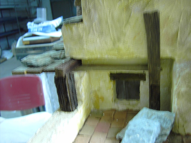 Ahora un pero ¿vale?... si yo fuera el albañil no me subiría a ese andamio... la parte de la izquierda me encanta, la has tratado muy bien... pero la de la derecha... me da un poco de yuyu ji ji... si fuera un andamio real... no sé... no sé ji ji... imagino que no lo has querido hacer hasta el suelo para no tapar la puerta y del mismo modo no tapar tampoco la escena del burrico en movimiento... si es por eso, podrías haber hecho la tabla del andamio más larga... recorriendo todo el perímetro de la fachada y así podrías haber puesto el lateral derecho hasta el suelo... en el próximo andamio que hagas... si me haces caso, tu albañil te lo agradecerá...