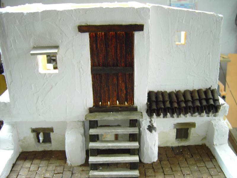 Las tejas se pueden pegar con silicona, cola blanca o cualquier otro pegamento sin disolventes, respecto al color, le doy primero una mano de nogalina y después las pinto con arcilla diluida con agua y cola blanca, también le doy alguna pincelada esporádica de color ligeramente verdoso.