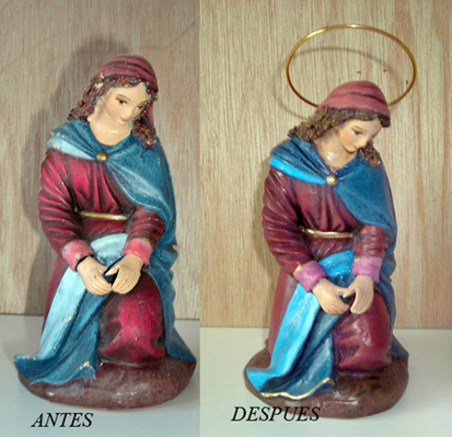 Una vez me pidieron "con la boca pequeña" retocar algunos pequeños roces en una imagen de Salzillo ¡ahi es nada! y les dije que ni loco, pero a estas menudencias de escayola o figuras de belen de barro y serie, no tengo incombeniente en hacerlo, asi que animo y poner vuestros arreglitos,abrazos para todos.