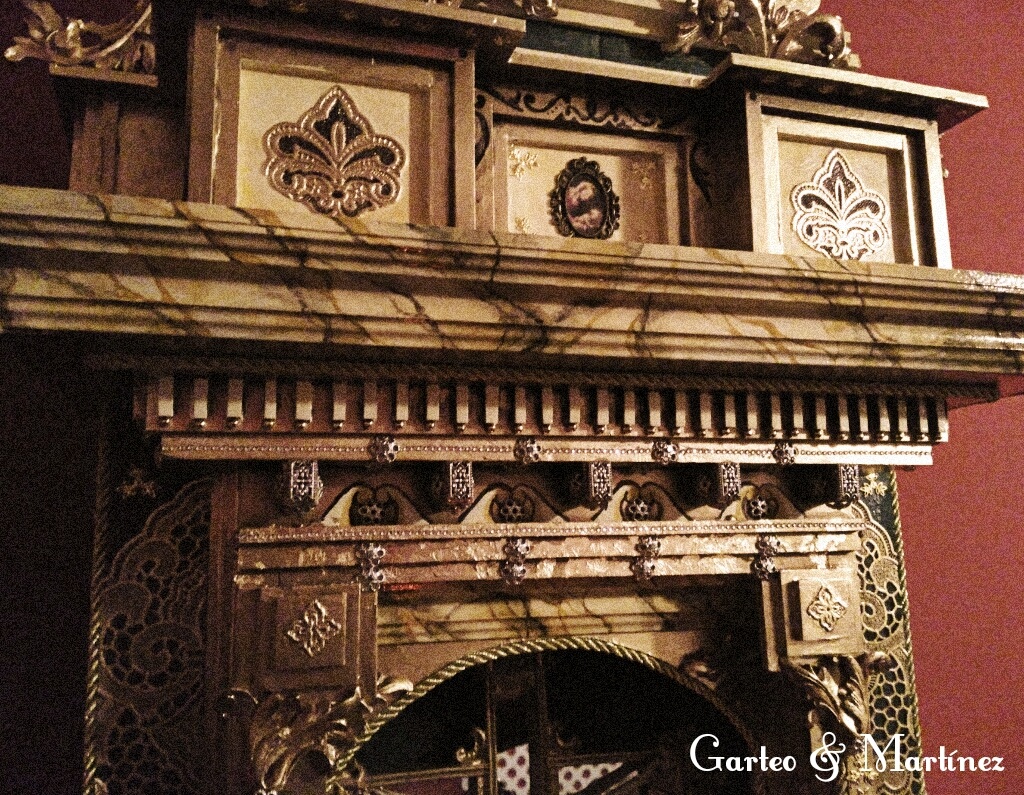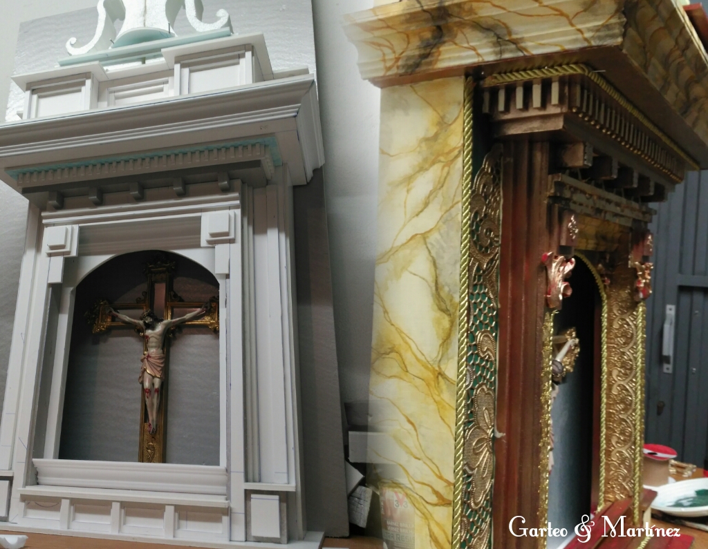 Va sobre fondo de terciopelo verde y todo cuenta con iluminación. Se han imitado con gran precisión los mármoles.