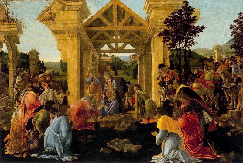 La primera represenatión que ahora recuerde es la de Alessandro di Mariano di Vanni Filipepi (Sandro Botticelli) Sin embargo en ella no todos los eruditos están de acuerdo. Lo que sí se puede observar es que el rey Baltasar posee una piel más oscura que los otros personajes del cuadro. Lo que hace pensar que allí ya se iniciaba la transicion iconoclasta.