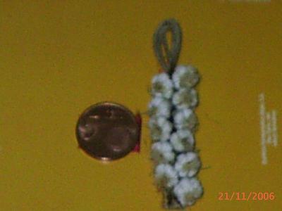 .- Las cabezas de ajos las engarzo con las cuerdas de lino de 1 mm en la trenza hecha con cuerda de pita, formando dos filas de 8 cabezas de ajos cada fila,