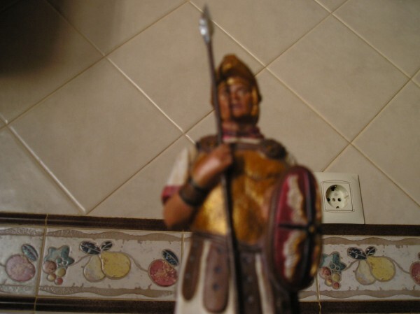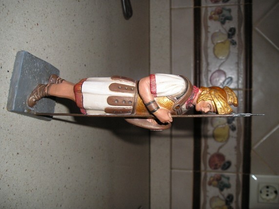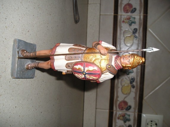 Hola, creo que tu soldado te quedo bastante bien por lo que se puede observar en la foto, se nota que pusiste especial interes en los detalles que le dan calidad a la pieza, me gustaria sugerirte algunas cosas, la verdad que la pintura ayuda mucho a la pieza de escayola, pero si no la pulimentamos nosotros; la pintura no hace milagros, los colores juegan un rol importantisimo como ya sabes tu, que se nota en la figura del soldado, pero aun se puede mejorar, los dorados u oro a mi parecer deben usarse con cautela, el blanco siempre es genial,pero rojos y dorados no son en el caso de un soldado muy conveniente, creo que dorado inclinado al bronce o bronce propiamente tal vale( bronce tiene un leve tono verdoso), las partes de cuero como cinturones y faldon se ven bastante bien, pero el cuero cafe tratalo de que se vea usado y no nuevo, bueno espero que algo te sirva las sugerencias.Dios bendiga. Una brazo