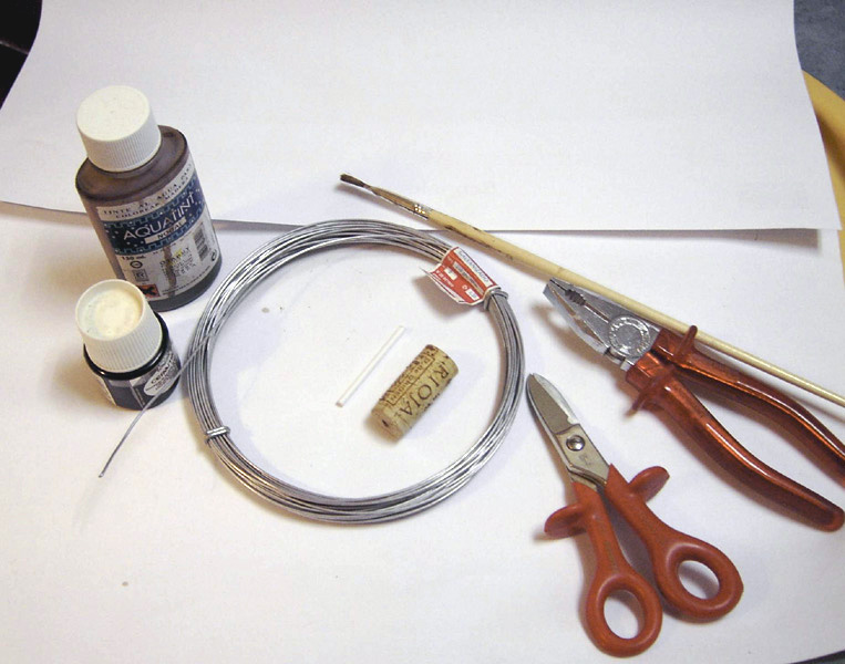 Dar nogalina al corcho y pintar el alambre de negro (segunda foto).