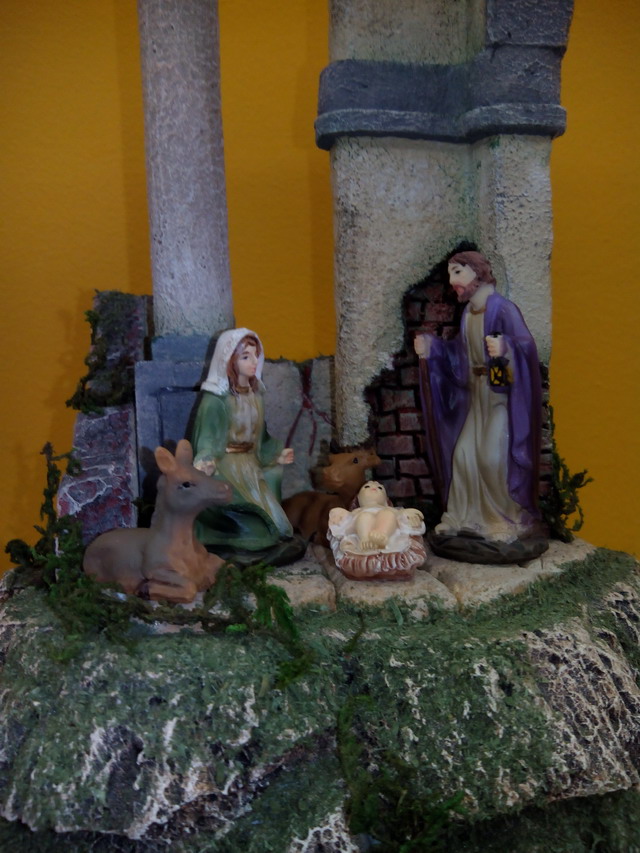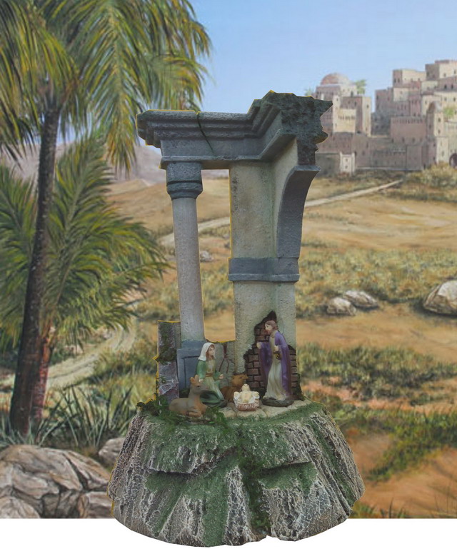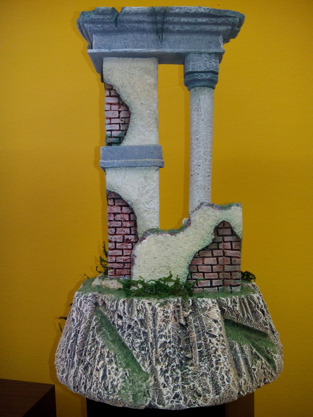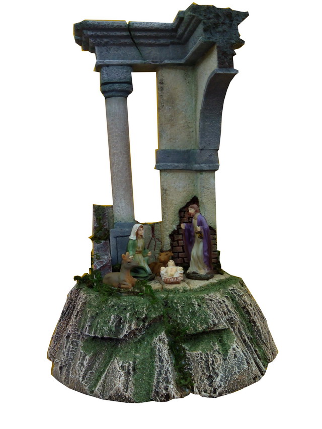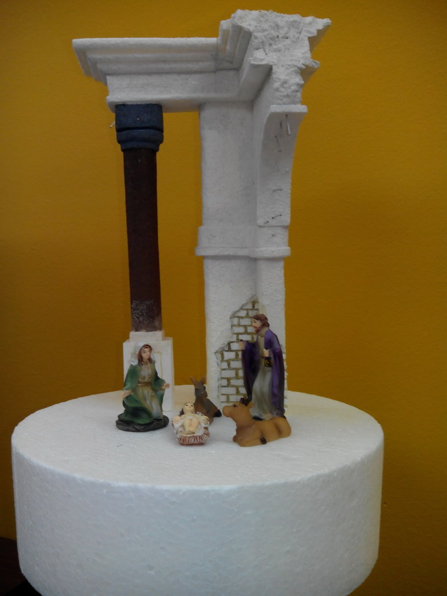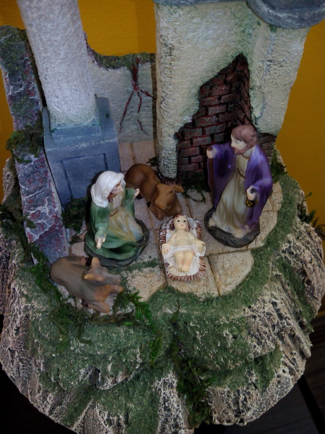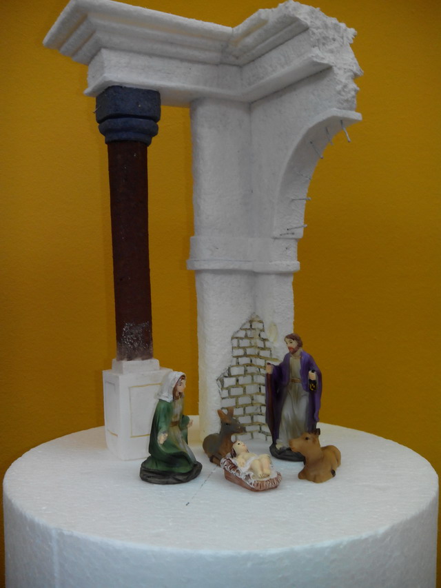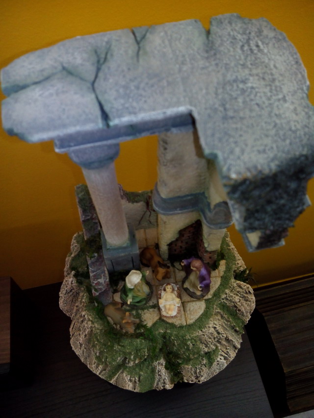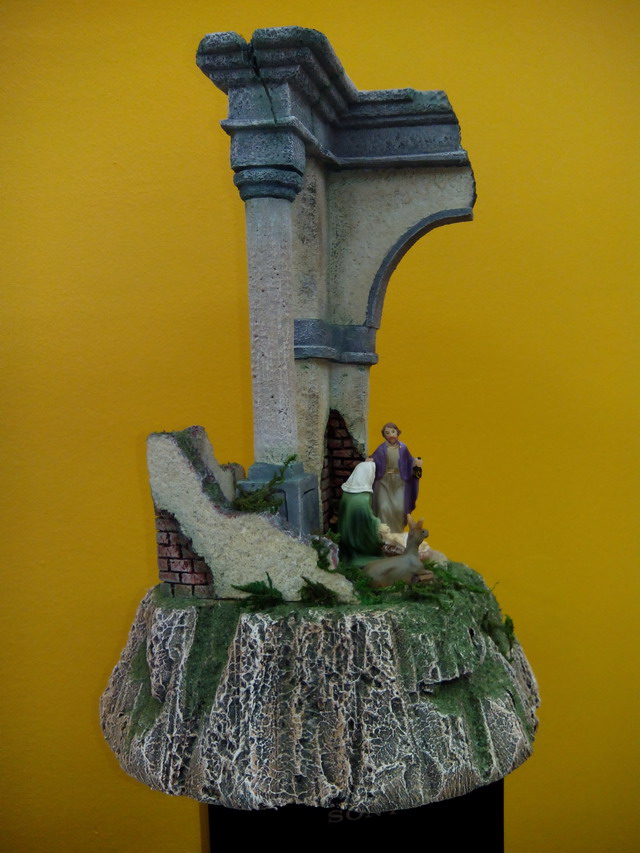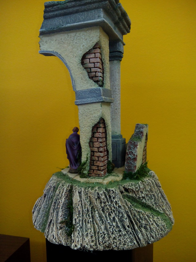 Os traigo otra trabajillo que he terminado y que es una Ruina Romana pequeña que está hecha para ser vista en 360ª ( en redondo) en corcho blanco la base (de bolitas) y corcho compacto el resto (el duro). Las medidas son de 30 de alto por 20 de ancho y fondo. Las figuras son de 6 cm. Es el pesebre perfecto para mesa ded oficina o espacios pequeños.