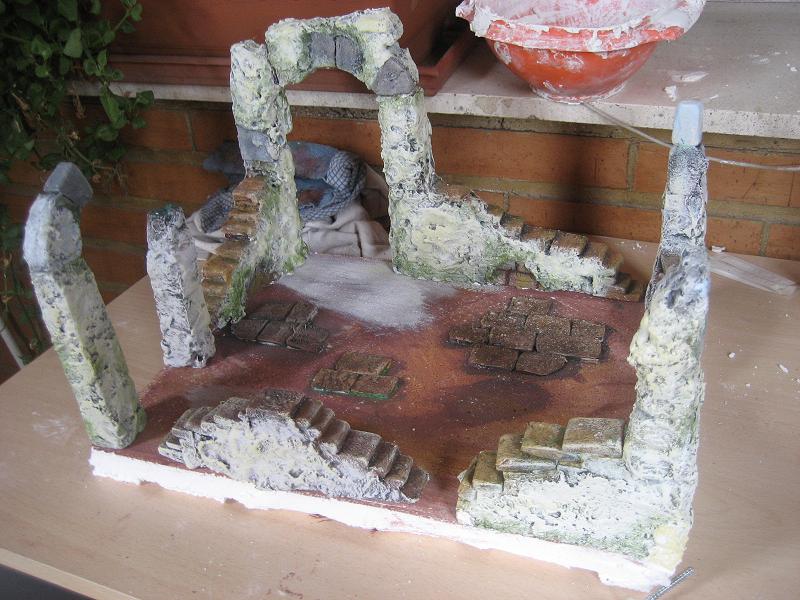 Hola Mario, vuelvo de vcaciones y veo que habeis trabajado de lo lindo. A mí me encantan las ruinas que has hecho, incluso con el color que tienen, pero si las quieres oscurecer algo, pues tu verás, también te quedaran perfectas; ahora solo queda que las llenes de figuras y te va a quedar de lujo. Muy buen trabajo.