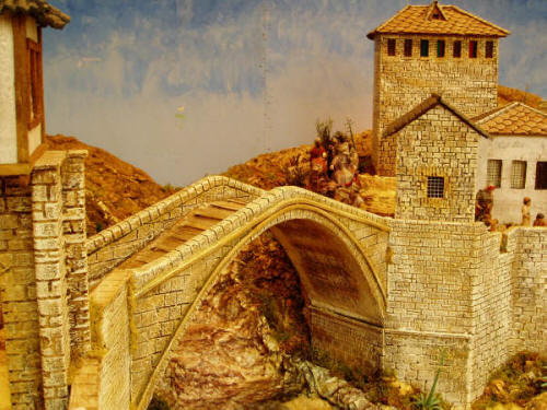 Efectivamente este Belén está hecho por la tienda EL PESEBRE (www.elpesebre.net). Esta realizado sobre el Stari most (puente viejo) de Mostar en Bosnia y Herzegovina, destruido en la guerra y reconstruido por la UNESCO como emblema de la ciudad. Uno de los hijos de los dueños de la tienda estuvo en Mostar en el ejercito en misión de paz. Sin duda una obra magnifica y un buen artista.