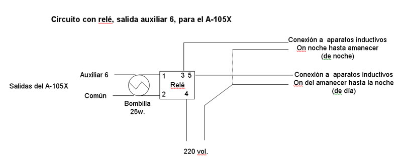 Sobre el esquema que pones, por si alguien no lo ha entendido, decir que es simple de comprender. Se ha utilizado un relé con un circuito conmutado. Esto de conmutado quiere decir que cuando el relé no se ha activado, está cerrado un circuito (3-4, por ejemplo) y queda abierto el otro (4-5), y cuando se activa entonces se abre el 3-4 y se cierra el 4-5. De esta manera puedes conseguir con un solo relé que unas cosas funciones y otras no (y viceversa) dependiendo de si está o no activa la fase 6. Si el relé se activa en el día entonces lo que se conecte al circuito 4-5 se activará durante el día y dejará de funcionar lo que esté conectado al circuito 3-4. Cuando termine la fase de día y se desactive el relé, dejará de funcionar lo que haya conectado en el circuito 4-5 del relé, y empezará a funcionar lo que esté conectado en el circuito 3-4 del relé.