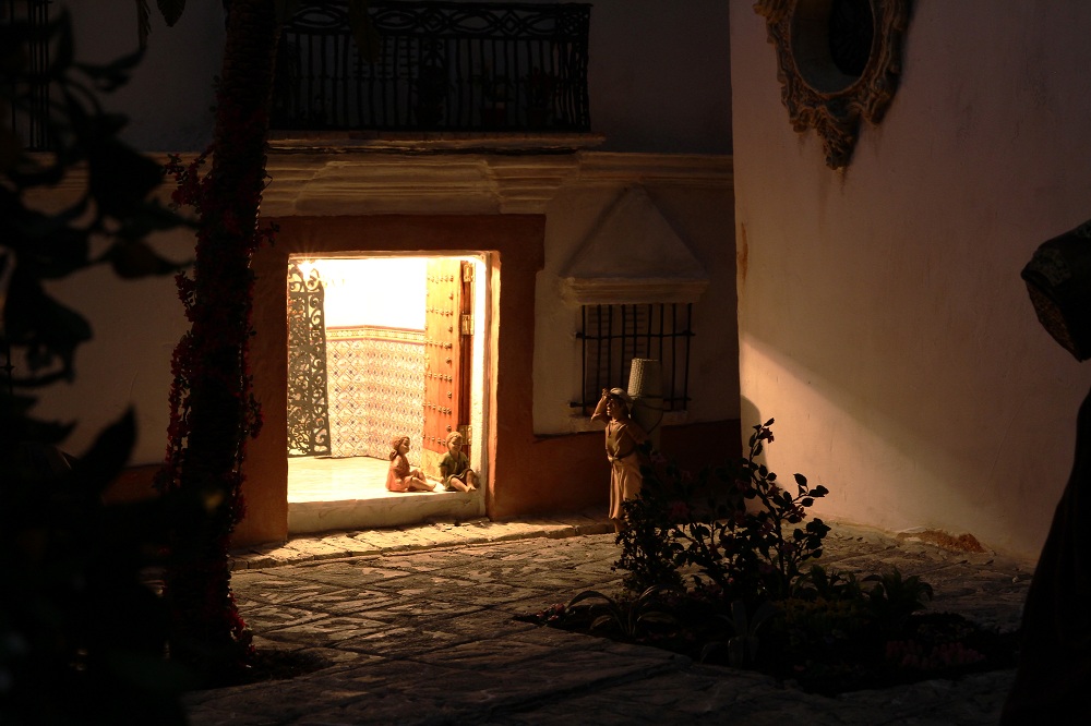 La foto anterior es el interior de la casa nº 5 de la Plaza de Madre de Dios donde se reproduce un cuadro de Maripe Pampín con su padre cuando era pequeña con los muebles de la época : En el Belén puede verse porque está un balcón abierto : la imagen de un cuadro al lado es la Virgen de la Caridad , patrona de Sanlúcar de Barrameda