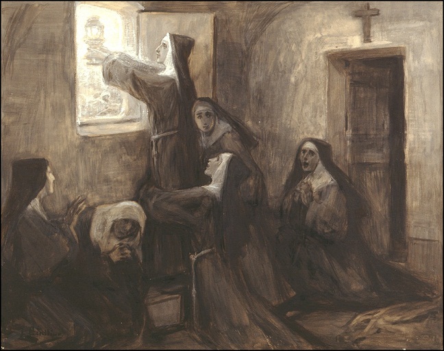 Por esos y otros admirables prodigios manifestó, aún en vida, la excelencia de sus méritos. Cuando ya se encontraba en las últimas, vieron entrar en el lugar donde yacía la sierva de Cristo una resplandeciente multitud de vírgenes santas adornadas con expléndidas coronas, entre las cuales una más majestuosa y bella que las demás. Llegaron hasta su lecho y, rodeándola, casi le dieron, con premuroso cuidado, alivio y consuelo.