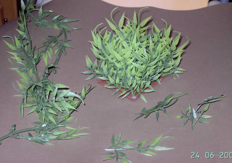 Tomar tallos de distintos tamaños y agruparlos en pequeños ramitos con un trocito de cinta “Flower Tape”, de esta forma habremos hecho una de nuestras plantitas. Deberemos hacer tantas plantitas como agujeros hayamos realizado.