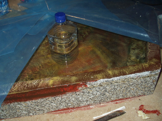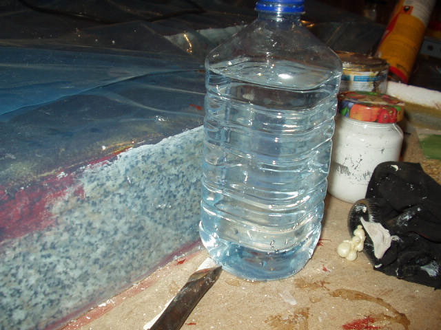 Pongo el plástico en el cauce, o por donde va a ir el cauce, por si acaso siempre, encima de ese plástico hago el cauce del río, bien con escayola, bien con cemento, bien con porexpan o con lo que se quiera y se domine mejor, cualquier material solido, yo concretamente lo hago con porexpan, le doy la forma y seguidamente lo pinto con pintura de revestimiento de fachadas, una mano gruesa; una vez seco, al día siguiente, le doy una mano aguada al 50 % de pintura de caucho (la que se utiliza en la construccion para azoteas y tejados), una vez seco, le coloco la malla correspondiente que se vende con la pintura, y se dan tres manos de pintura de caucho, dejando secar una de otra y pura, sin agua alguna. Seguidamente pinto a gusto y lo decoro con tierra, piedras, ramas, etc. Tener por seguro que ese río no se sale lo mas minimo.