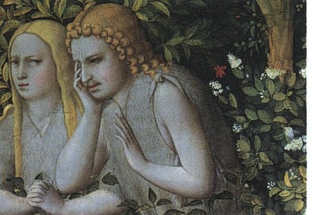 2 - Adán y Eva , en actitud de arrepentimiento, aparecen en el vergel vestidos con pieles en el momento de ser expulsados del Paraíso por un á ngel , que vigila que abandonen el mismo. Simboliza la escena el principio y el final del pecado , los primeros padres y la salvación del hijo de María. Fijaros que parecen estar pisando el jardín de María, relacionando la escena del Génesis , quedando así evidente la promesa del Salvador y la Anunciación.
