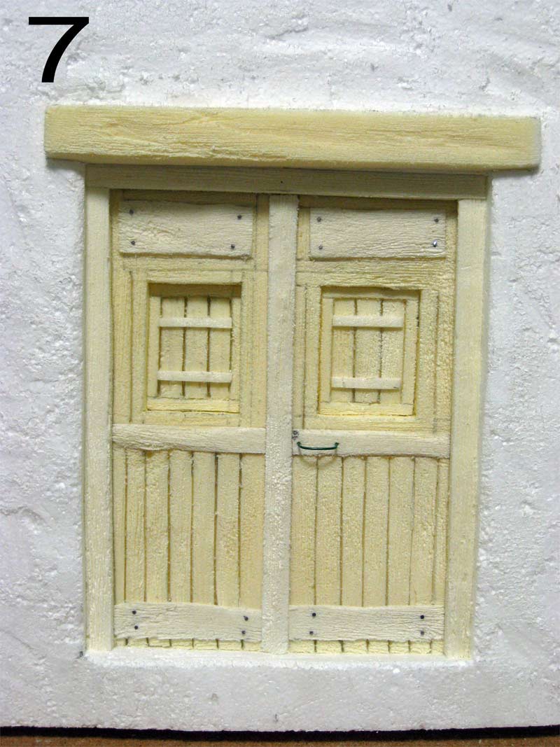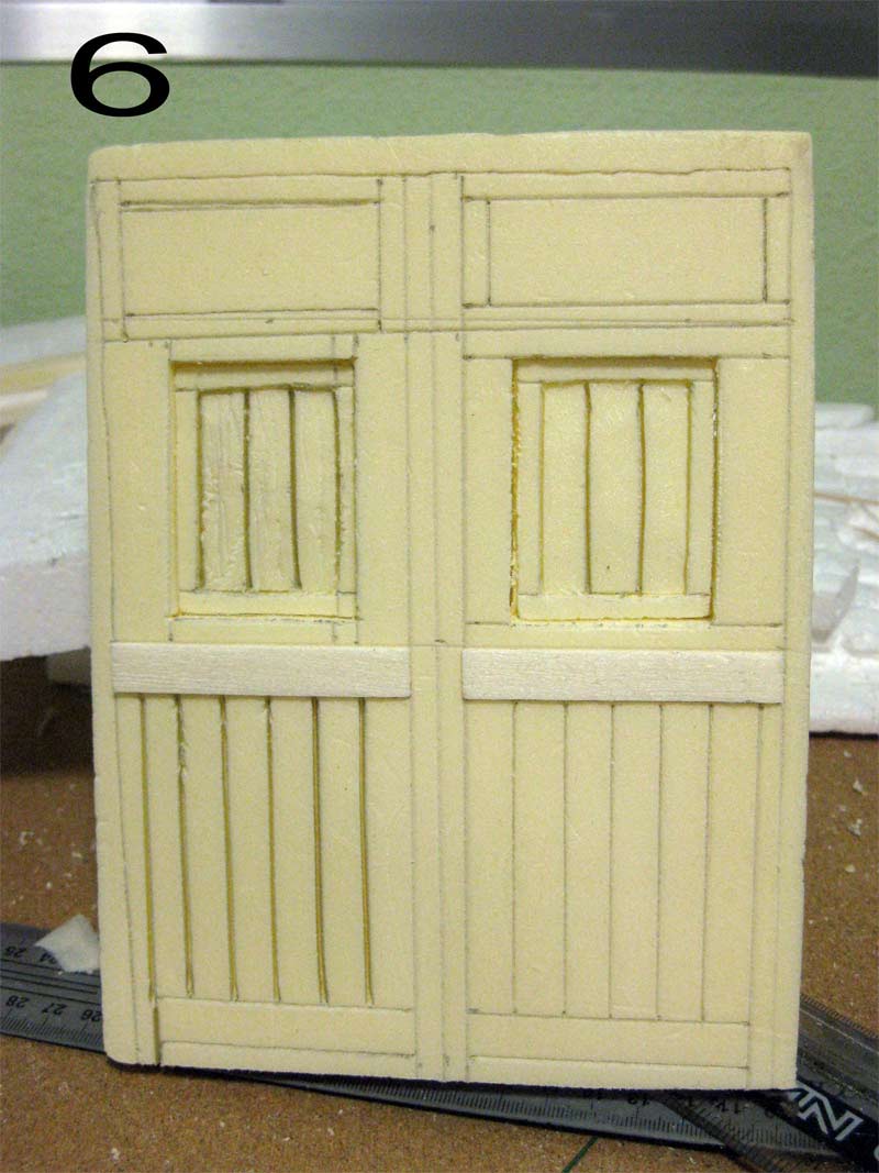 FOTO 5 BIS : Una vez dibujado la puerta y vaciado el hueco ,dibujamos la viga y rebajamos el porex según nos guste el grosor de la viga y con porex extruido hacemos la viga y la trabajamos con el cuter y el cepillo de alambre para dar textura y la pegamos .En la misma foto os muestro como fabrico una puerta ,corto unas tiras de porex extruido que me hará de marco y a su vez disimulara las posibles grietas que nos queden al hacer la puerta con el porex extruido