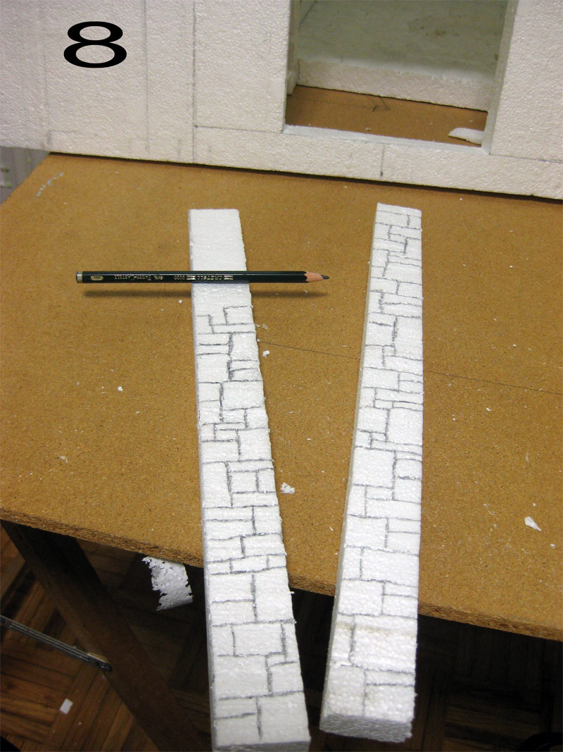 FOTO 8 : Dibujaremos las piedras en las columnas ,para luego con soldador y cuter tallarlas