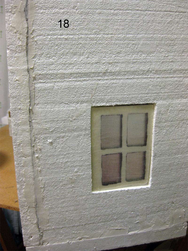 FOTO 14 : Detalle de la colocacion de un cristal ,con un plástico de carpeta clasificadora ,cortamos a la medida del interior de la ventana ,con el taco de lija lo lijamos y le quitamos la transparencia ,pero que se pueda ver luz y lo tenemos .