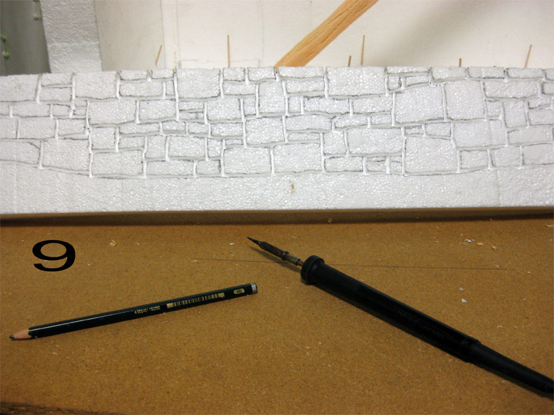 FOTO 8 : Dibujaremos las piedras en las columnas ,para luego con soldador y cuter tallarlas