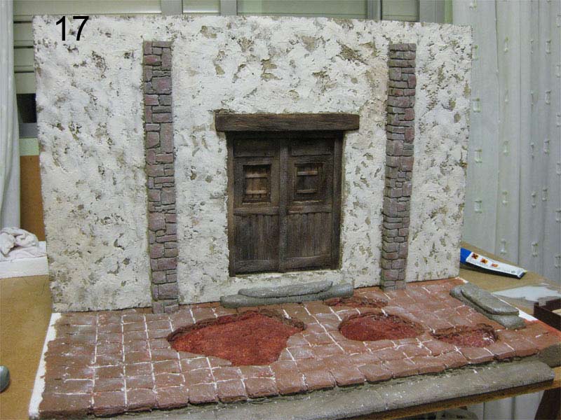 FOTO 13 : Haremos lo mismo en las otras piezas ,y pintaremos las partes de madera con pasta Adefix y nogalina en polvo ,y daremos una primera mano a las partes de piedra ,sombra natural y pasta adefix ,el suelo también una primera mano .Y esperar que seque .