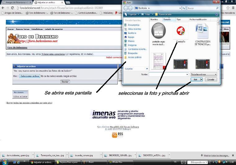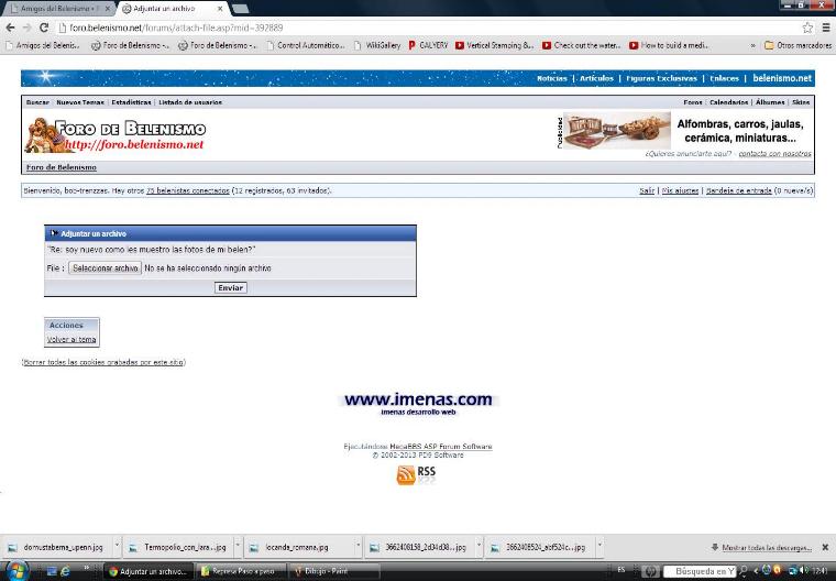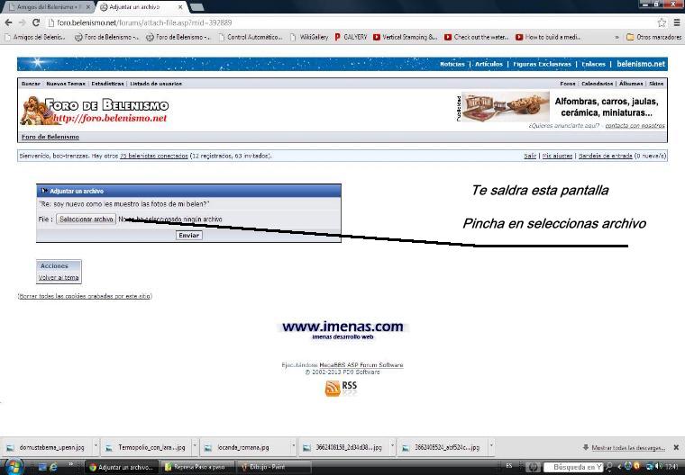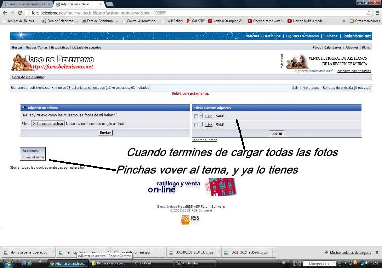 Buenas noches y bienvenido. Intentaremos echarte una mano. Cuando cliques en "nuevo tema" al final de la página sale un recuadro que debes rellenar "adjuntar un archivo después de enviar" , desupés de enviar el mensaje escrito te saldrá una nueva opción de añadir archivo, y es allí donde, de una en una debes ir mandando las fotos.