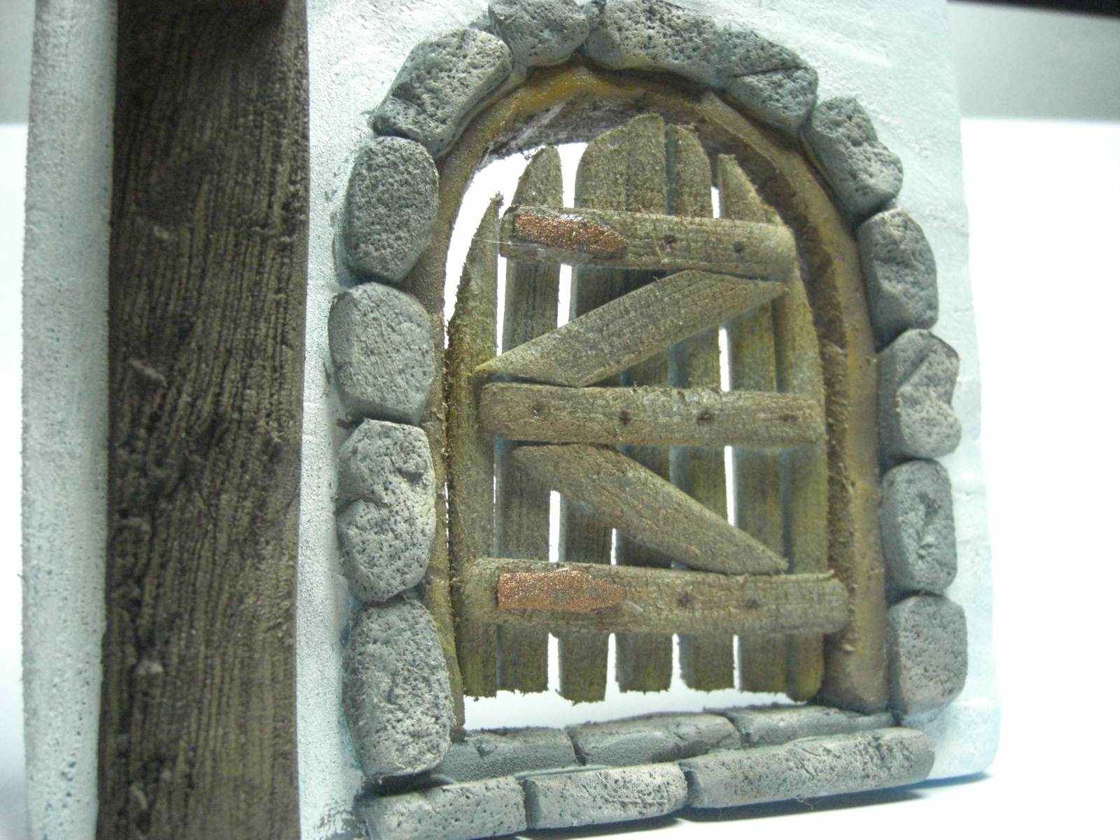 Yo quiero aportar mi humilde opinion sobre la puerta: Ademas de marcar mas las vetas con cualquiera de los procedimientos descritos arriba, seria bueno pintar primero con una base mas oscura para que las grietas resalten mas conforme se van aplicando los colores claros por encima. Los refuerzos (tablones transversales) de la puerta se podrian cortar de un material mas delgado por que se ven muy gruesos y dan la impresion de que los refuerzos pesan mas que los tablones de la puerta. Se puede usar el poliestireno expandido que se usa en las bandejitas de las verduras. para hacer los tablones, asi salen mas delgados que cuando se cortan de porex rosa. Y tambien las piedras del arco deben estar cortadas ( aunque sea rusticamente) para encajar una encima de otra y formar un arco que se sostenga, sin olvidar la piedra clave justo en medio.