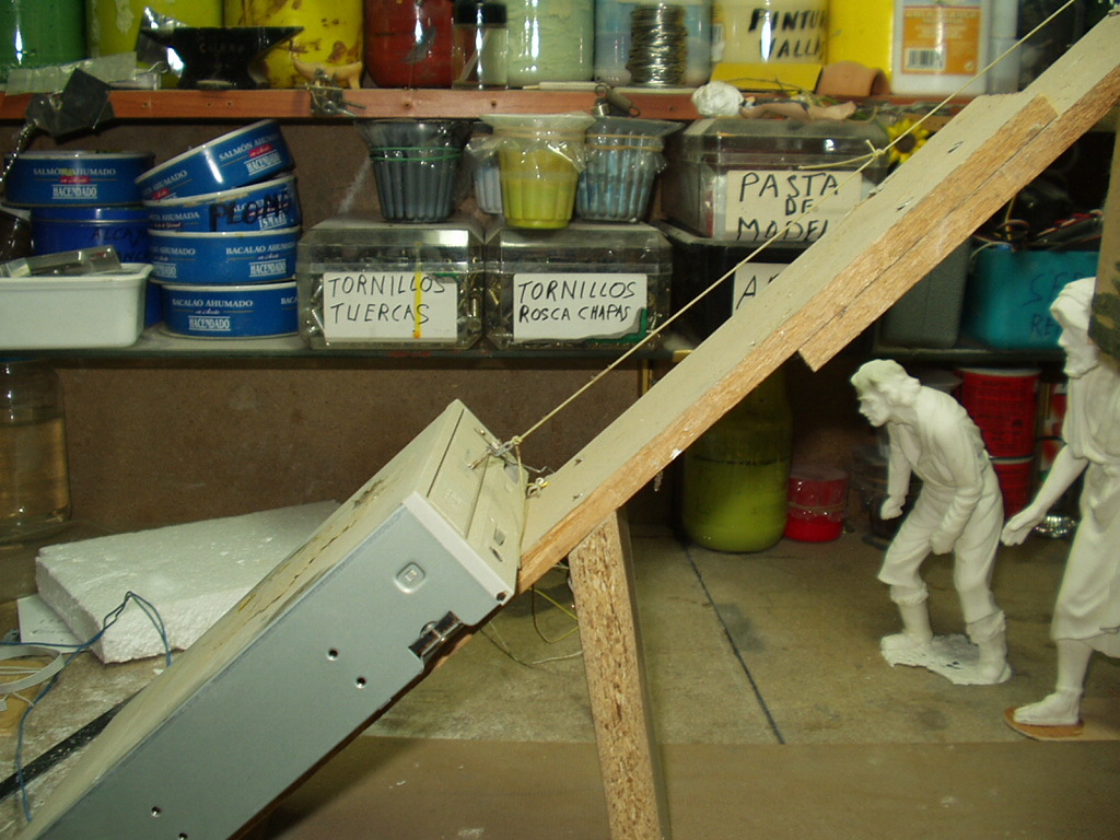aqui os pong un artilujio que hice hace cuatro o cinco años consiste an montar un lector de cd viejo como vereis en la bandeja puse un tornillito para amarrar el sedal luego hice una especie de cajon donde se escondia el angel el cajon el cajon lo disimule pegando algodon que simulaba una nuve