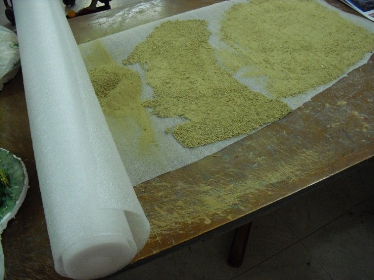 Sobre este material le he extendido una capa de cola blanca y despues la he cubierto con arena y piedrecillas (la mezcla que utilizan para hacer el mortero en las obras)