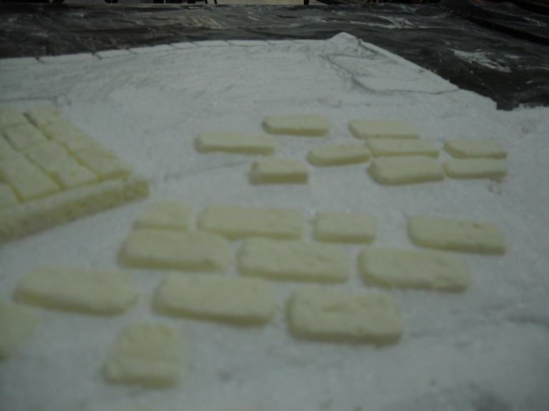 NOOOOOOOOOOOOOO miim, las baldosas estan pegadas antes de poner la escayola, fijate en la primera y segunda foto que ya estan pegadas las baldosas, despues con una piedra con muchas irregularidades les doy golpecitos para hacer las marcas y es despues de esto que le pongo la escayola mas bien clarita porque la base del suelo es de porex de bolitas que le quito trozos para que tenga iregularidades.
