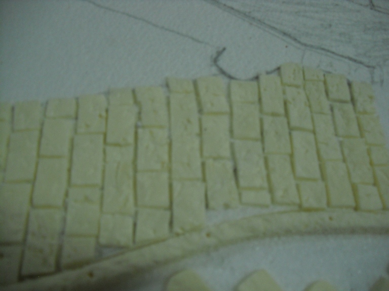 NOOOOOOOOOOOOOO miim, las baldosas estan pegadas antes de poner la escayola, fijate en la primera y segunda foto que ya estan pegadas las baldosas, despues con una piedra con muchas irregularidades les doy golpecitos para hacer las marcas y es despues de esto que le pongo la escayola mas bien clarita porque la base del suelo es de porex de bolitas que le quito trozos para que tenga iregularidades.