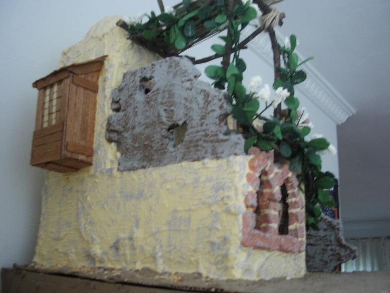 Hla Isamael tu primera casa te ha quedado muy bien y si te digo la verdad ha sido una de las pocas que me ha impresionado porque esta si que tiene estilo hebreo y ademas un poco como pobre genial yo lo que haria seria pasarle la lija por encima. Sobre la pintura yo utilizo los tarros pequeños de hidralux pero si tu quieres pintar casas yo creo que es mejor el grande y si quieres hacer ese color si usas amarillo, un poco de rojo (con marron o oscuro) y despues