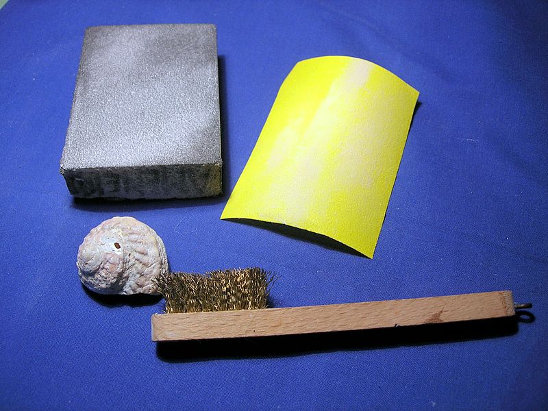 Las herramientas que utilizo son: taco de lija de esponja, lija normal de grano un poco grueso, un objeto irregular para golpear y dar forma (en este caso una concha de caracol marino (mi proximidad al mar me lo permite) y un cepillo de cerdas de metal.