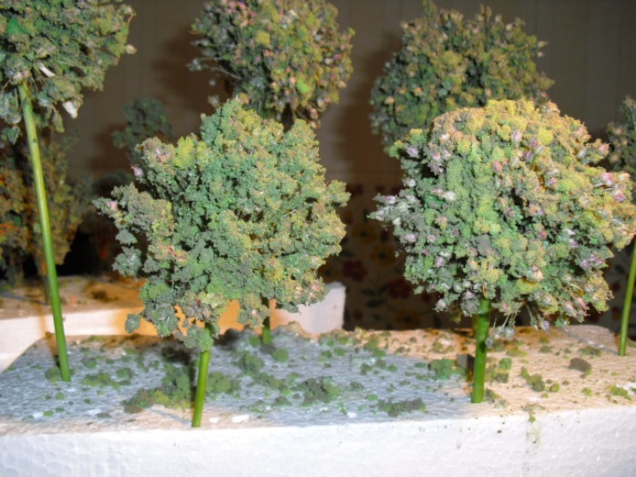 Son unos arboles fantasticos y por el tamaño van muy bien para lejania, lo que les has pegado es flocado del que venden en las tiendas de manualidades??? has probado a mezclar diferentes tonos de verde o incluso verde con otro color para ver si el efecto es bueno???