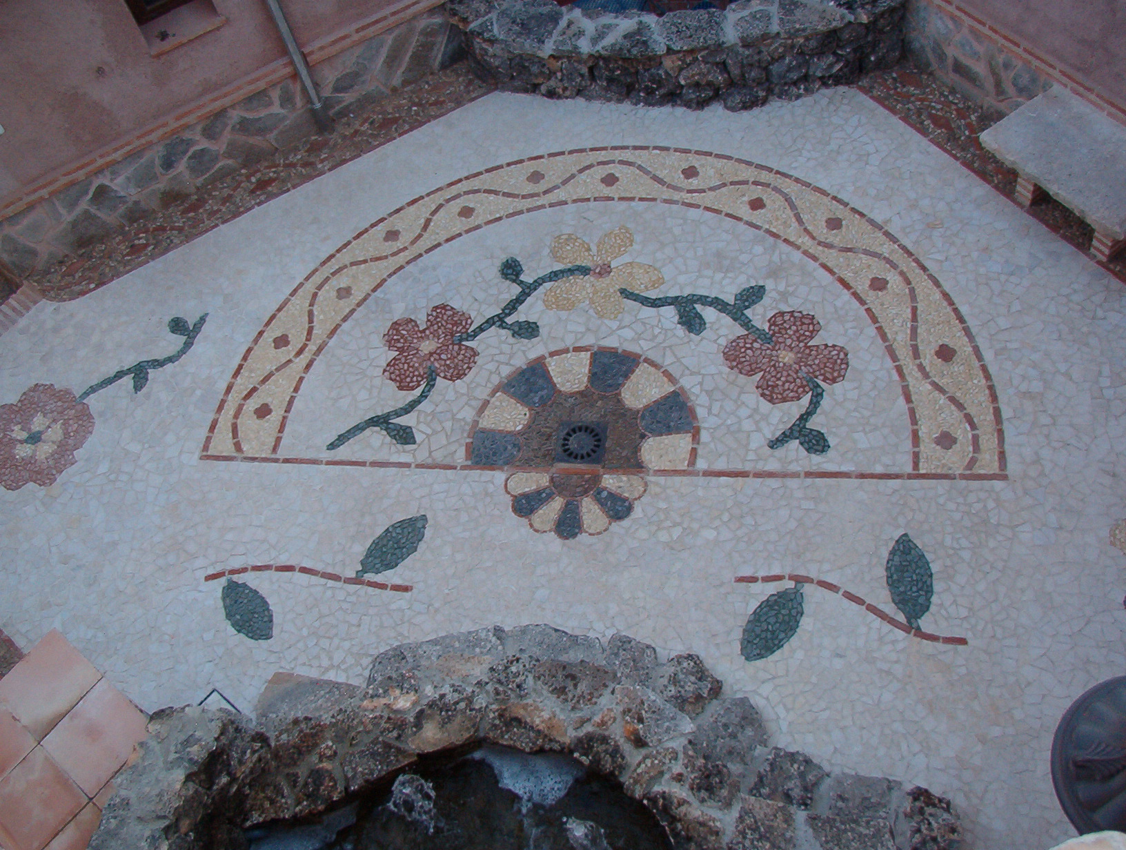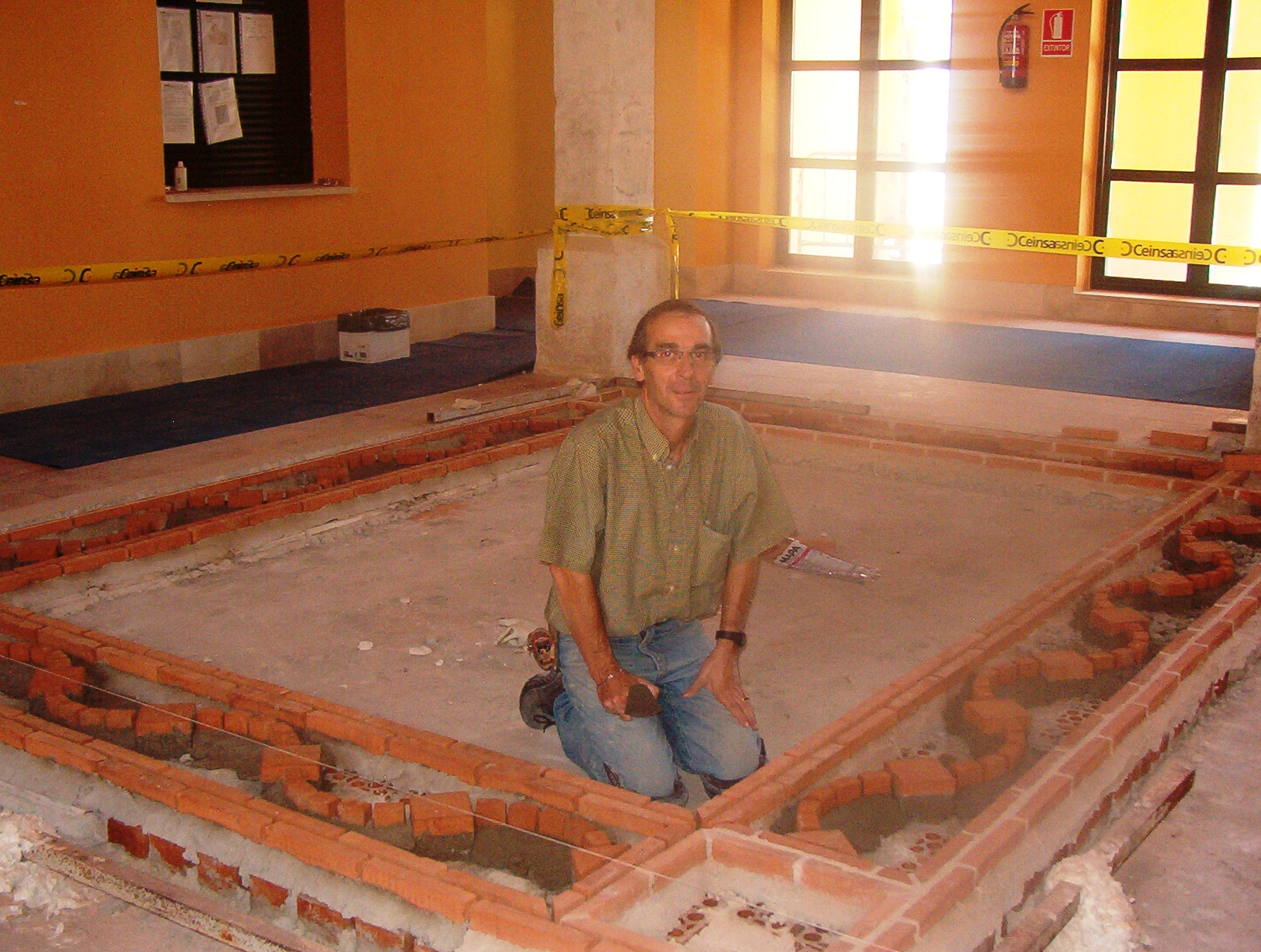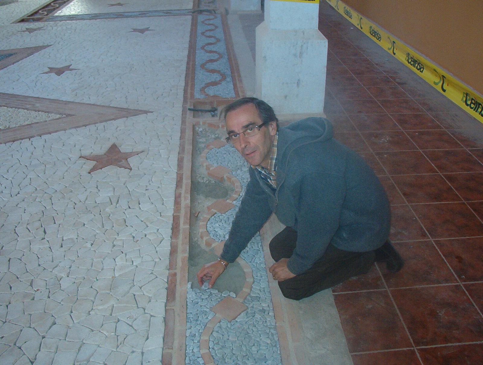 La tesela de mármol o piedra caliza ( es como se denomina a los trocitos de piedra y mármol y pueden ser regulares o irregulares) se va introduciendo en el mortero de cal viva que vamos manteniendo fresco durante todo el proceso de construcción, a base de pulverizar agua. Ya después cuando esté terminado, fijamos mediante cola de conejo y gasas las teselas y desechamos todo el mortero de cal, éste simplemente nos sirve de ‘lienzo’ provisional donde ir conformando el trabajo…