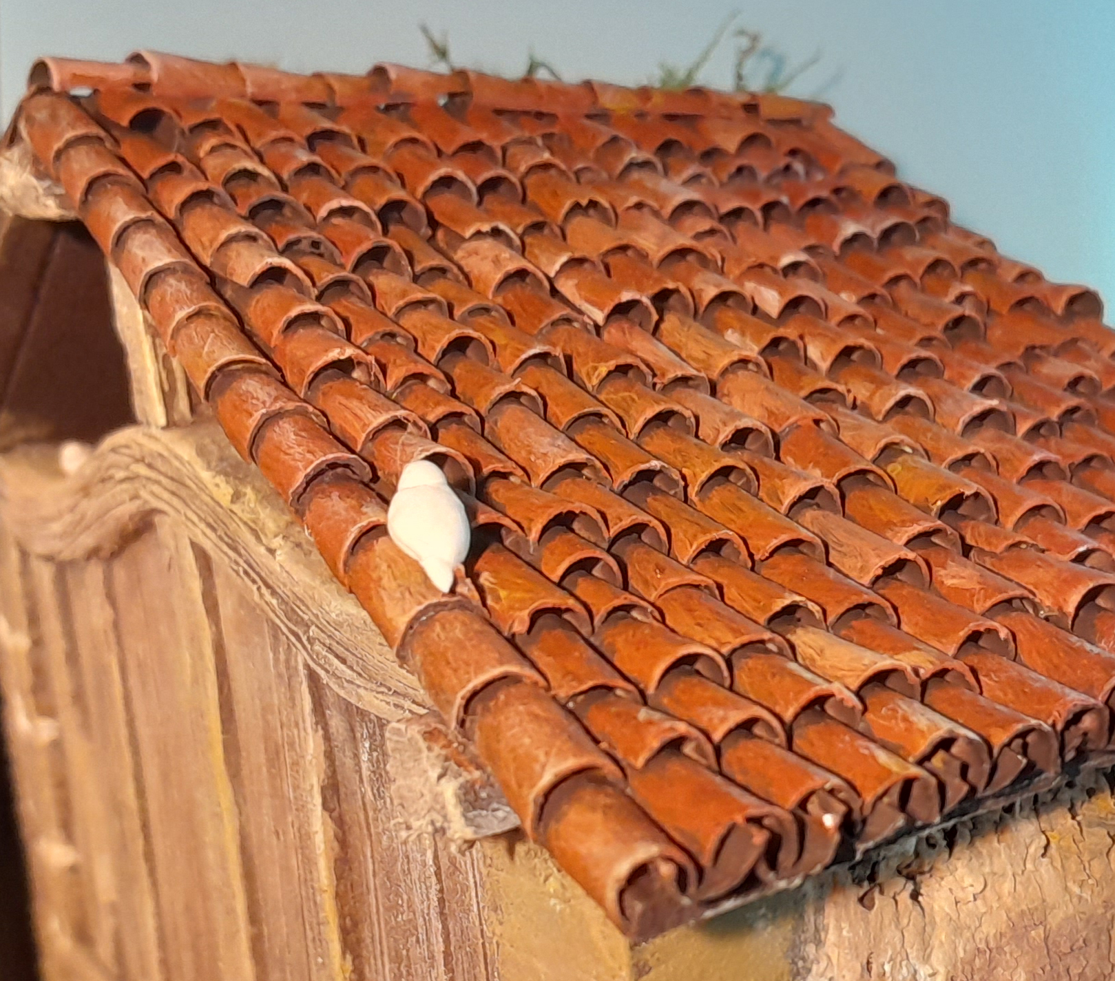 Las ventajas de este material son varias: por un lado, me preocupaba la posibilidad de que al humedecerse las tejas con la cola se perdiera la forma, pero no ocurrió. En realidad, supongo que están preparadas para soportar humedad sin deformarse, pues de otro modo no servirían para beber. Por otro lado, al ser de cartón, absorben fácilmente tanto la cola como la pintura, por lo que se pegan bastante rápido y también se pintan bien.