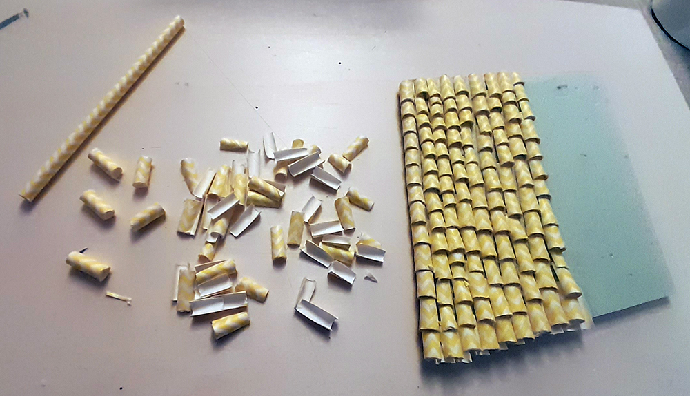 Pensando en cómo hacer las tejas para el establo, se me hacía cuesta arriba la idea de recortar un cartón y curvar las tejas una a una... entonces caí en que, en los últimos tiempos, las pajitas de refresco han dejado de fabricarse en plástico y ahora las hacen de cartón... pensé que podía ser una solución, y así fue.