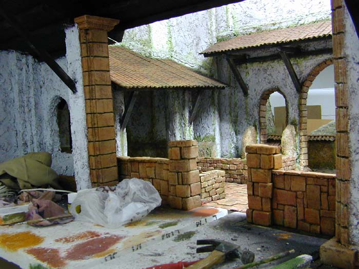 El belén del pasado año debía tener lluvia. Era un gran reto, el Belén que realizo lo debo desplazar desde donde lo hago a una sala de exposiciones, su montaje se debe hacer en unos 5 ó 6 días y llevarlo a una segunda planta con unas escaleras bien empinadas. Bueno no me voy a extender.