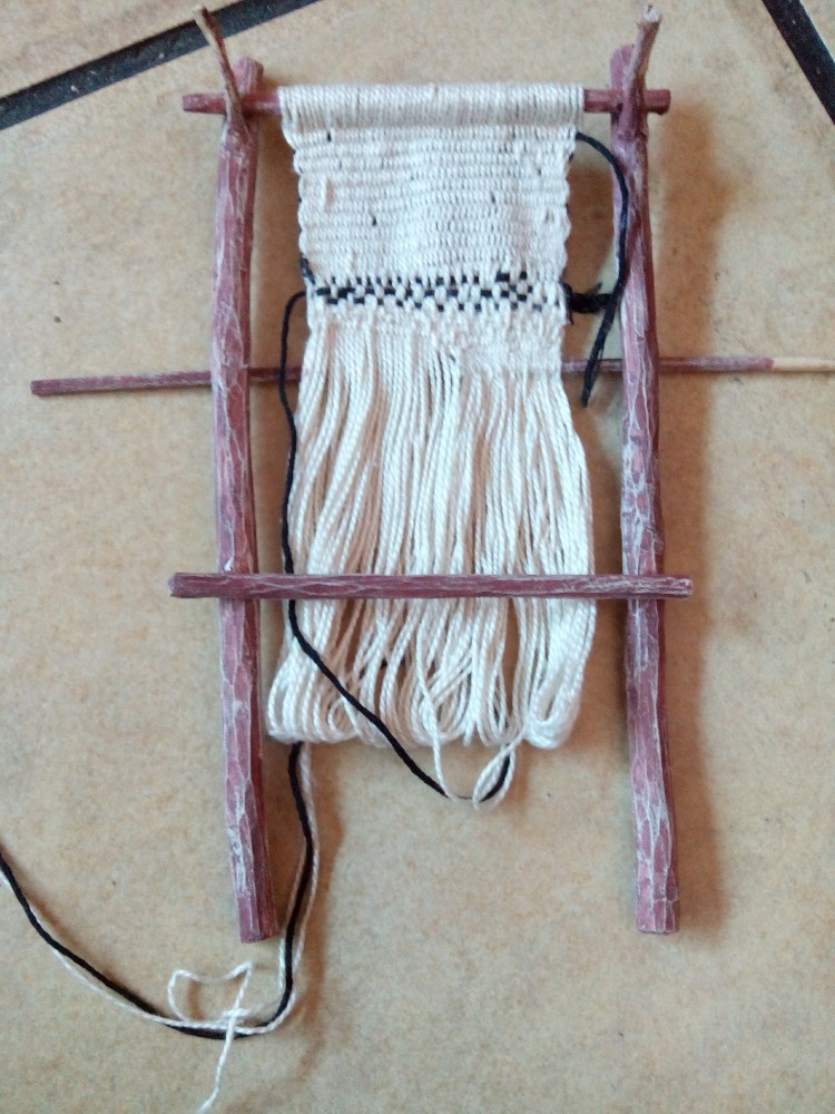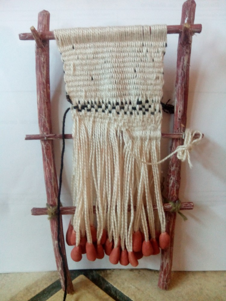 Hacemos un bastidor y enrollamos hilo para tejer el tejido y una vez hecho lo colocamos en los travesaños del telar una vez pintado este. Una vez colocado y centrado cortamos la parte de abajo una vez montado el telar y con bolitas de pasta hacemos los pesos que tensaran el hilo.