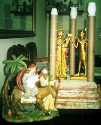 LES PRESENTO EL TEMPLO EGIPCIO QUE ESTAMOS PREPARANDO PARA LA ESCENA DE LA HIUDA, ESTA LABORADO CON FIGURAS DEL ALMACEN DE TODO A DOLAR; LAS COLUMNAS SON DE ROLLO DE PAPEL TOALLA DE COCINA Y LOS RECUBRIREMOS POSTERIOSMENTE CON UNA LAMINA DE FIGURAS; LOS CAPITELES SON DE BOTELLAS VACIAS DE YOGUR PARTIDAS A LA MITAD