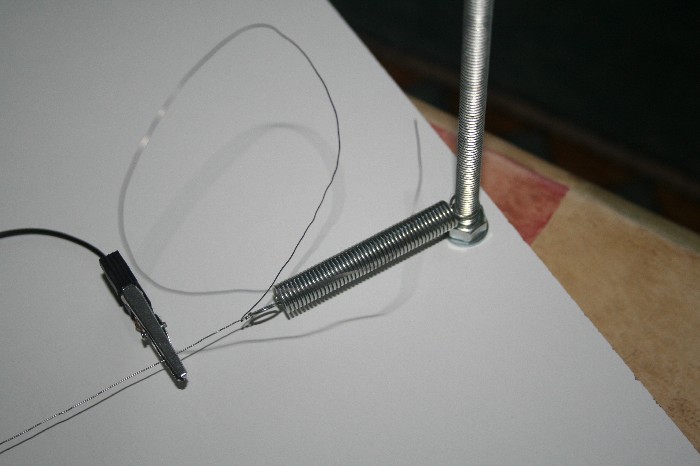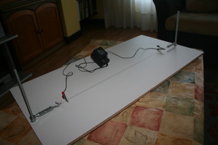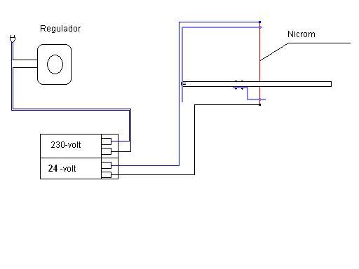 Pues eso me fabrique una cortadora de porex, hice primero una horizontal, por eso de que me parecia más facil la fabricación. Mide 80 x 50, el hilo mide unos 62 cm, utilice un transformador regulable de 1,5 a 12 V y de 500 mA (no se lo que significa), primero use un hilo de nicron de 0,3 mm (muy debil y que rompe con mucha facilidad) y ahora estoy utilizando un hilo sacado de un secador (mucho más gordo y resistente, parece alambre). La cuestión está que no me calienta el hilo, cuando usaba el de 0,3 tenia que acercar las pinzas de los cables del transformador para que calentase algo el hilo, y ahora que utilizo el del secador, ni calienta.