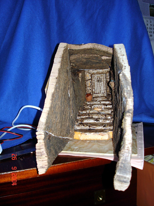 · 06-Luz detrás de puerta, en la parte superior de la escalera se monta un pequeño recinto donde se coloca luz tenue para simular la que pudiera venir de la casa de arriba. La cinta metalizada permite mejorar la luz.