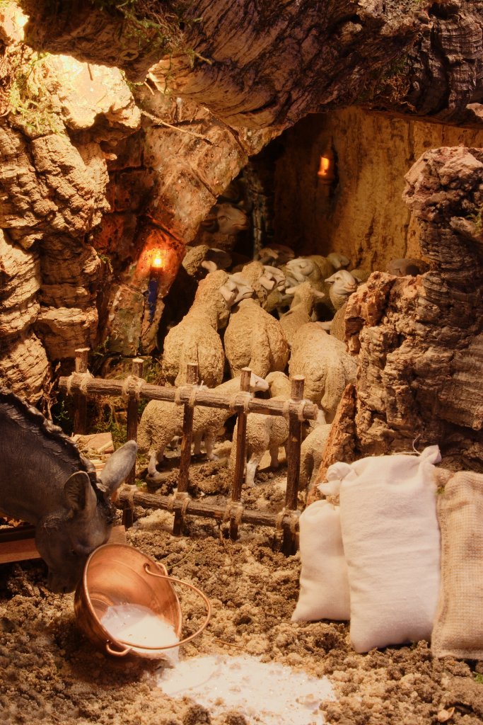 · 101-El ganado, a estabular que forma el objeto real. En este caso está formado por corderos de 11, 16 y 20 cm y dos cabras de 20 cm. Todos ellos de J.Joaquin Pérez. La cueva del Nacimiento en donde está el aprisco tiene figuras de 24 cm de J.L. Mayo.