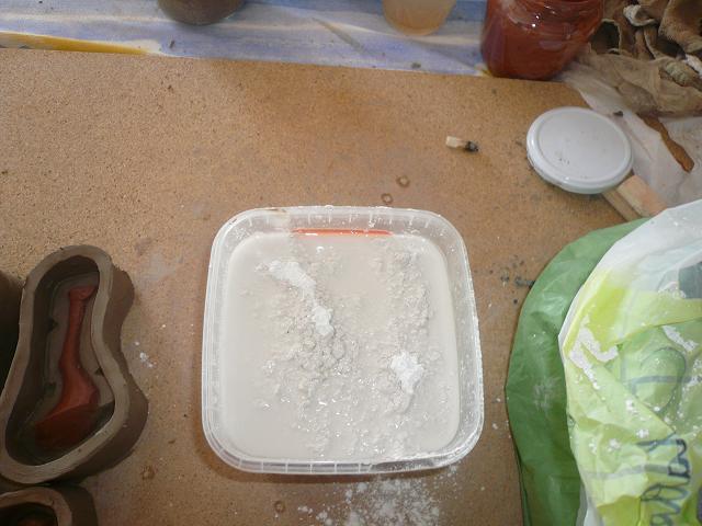 Antes de depositar la escayola untamos toda la figura y la base de la primera parte de escayola con barbotina para que no se pegue la segunda parte del molde sobre la primera. El mejor desmoldeante para la escayola es el barro diluido con agua y para esta operacion deb ser muy clarito, o sea muy aguado.
